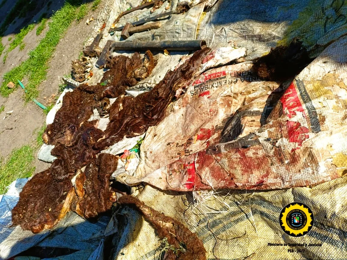 El operativo se desplegó con la participación de móviles de diversas brigadas, incluyendo Arroyo El Cura, Perdices, Potrero y Gualeguay, además de unidades motorizadas. Las medidas judiciales iniciaron en la mañana, y en una vivienda de calle Cafferata se halló un freezer que contenía 200 kg de carne vacuna, la cual presentaba evidencias de una faena ilegal, como restos de pasto, tierra y pelos. También se encontraron retazos de cuero de los mismos animales.