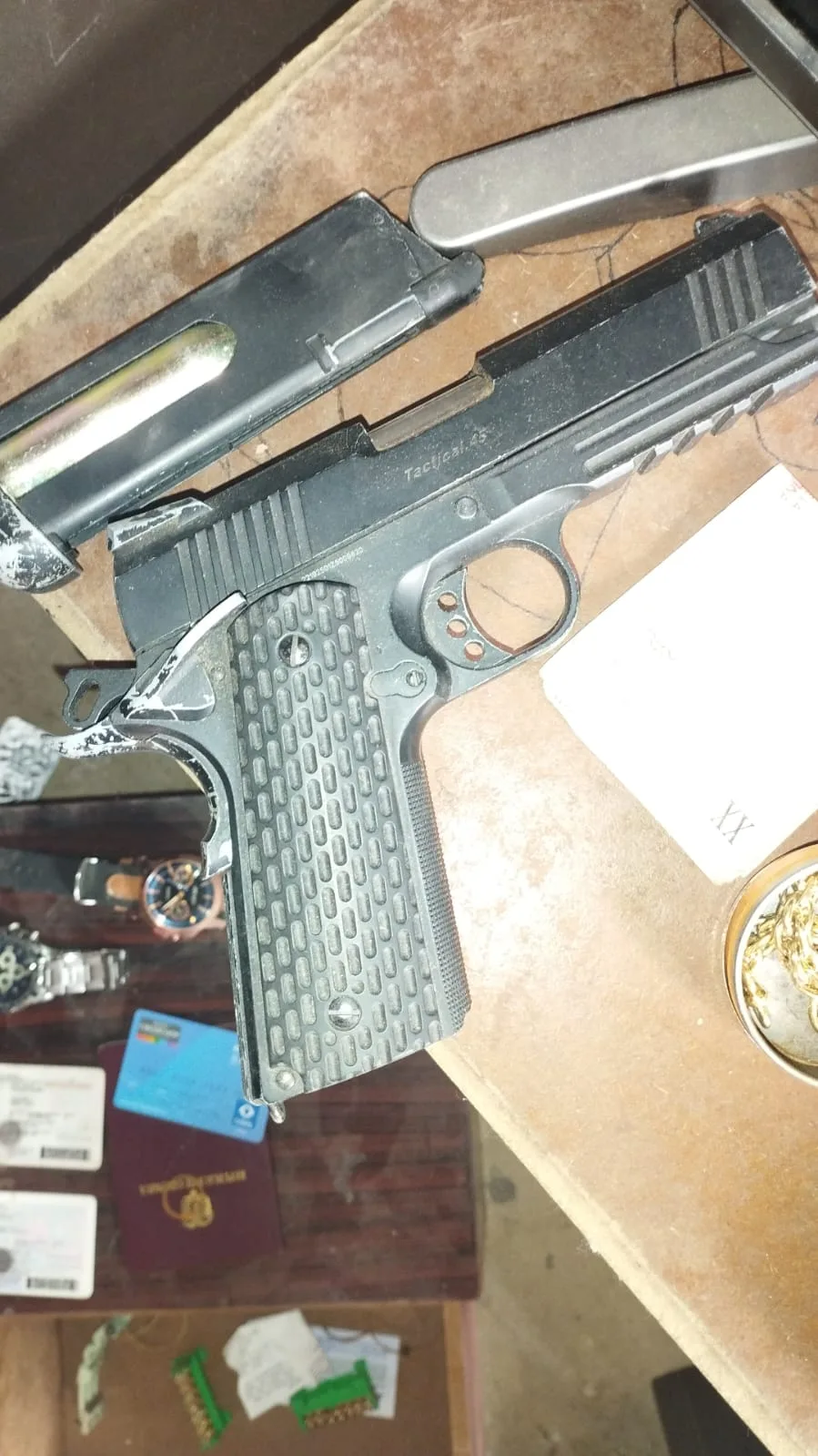También fueron incautados troqueles en blanco y con datos manuscritos, tarjetas de débito a nombre de terceros, folletos sobre préstamos personales, cuadernos con anotaciones y una réplica de arma de fuego, entre otros elementos. Entre las armas encontradas se destaca un revólver marca Doberman calibre .22 con 10 cartuchos y una réplica de arma de 9mm.