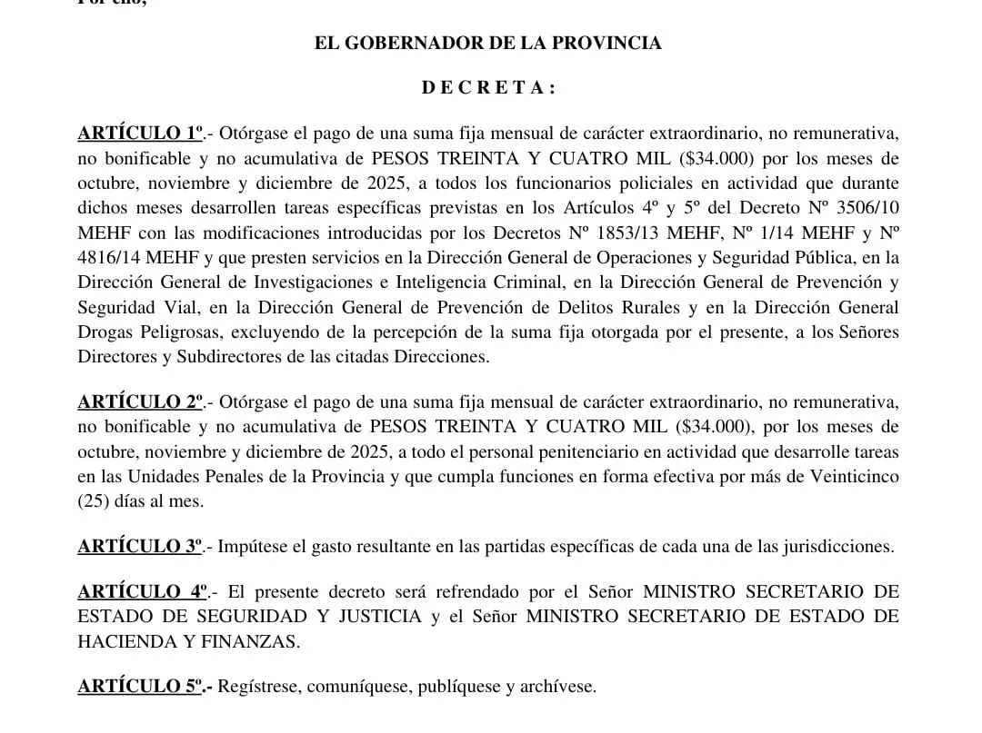 Por decreto, el Gobierno provincial oficializó el pago de una suma fija mensual de $34.000, de carácter extraordinario, no remunerativo, no bonificable y no acumulativo, destinada al personal policial y penitenciario en actividad que cumpla funciones específicas durante los meses de octubre, noviembre y diciembre de 2025.