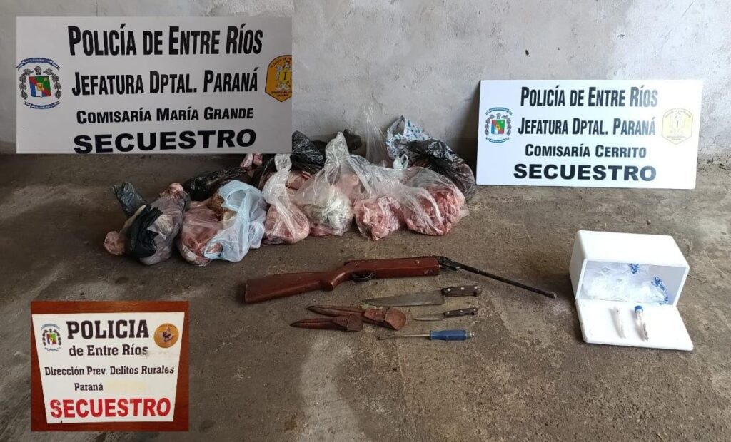 Tras una exhaustiva búsqueda, se secuestraron diferentes cortes cárnicos, entre los que se encontraba la cabeza de un ternero, con orificio de impacto, desde donde se extrajo por parte de la veterinaria policial, un proyectil calibre .22, y restos de pelo color marrón. Asimismo, un cartucho calibre .22, un aire comprimido reformado a calibre 22, dos cuchillas, un destornillador, y un automóvil Ford Fiesta interesado. Además, se tomaron placas fotográficas de manchas de sangre en el baúl del auto, pasibles de pericias.