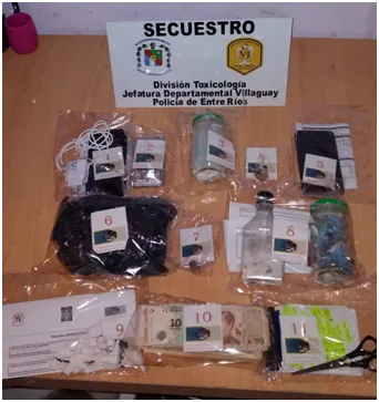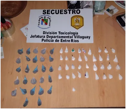 Como resultado, se secuestraron 114 semillas, 0,74 gramos y 28 envoltorios de la especie cannabis sativa (marihuana), 38 envoltorios de clorhidrato de cocaína con un pesaje de 27 gramos, dos teléfonos celulares, una balanza, elementos para preparación y fraccionamiento de sustancias, y dinero en efectivo, procedimiento en el que participó “Dylan”, can adiestrado para la búsqueda de estupefacientes.