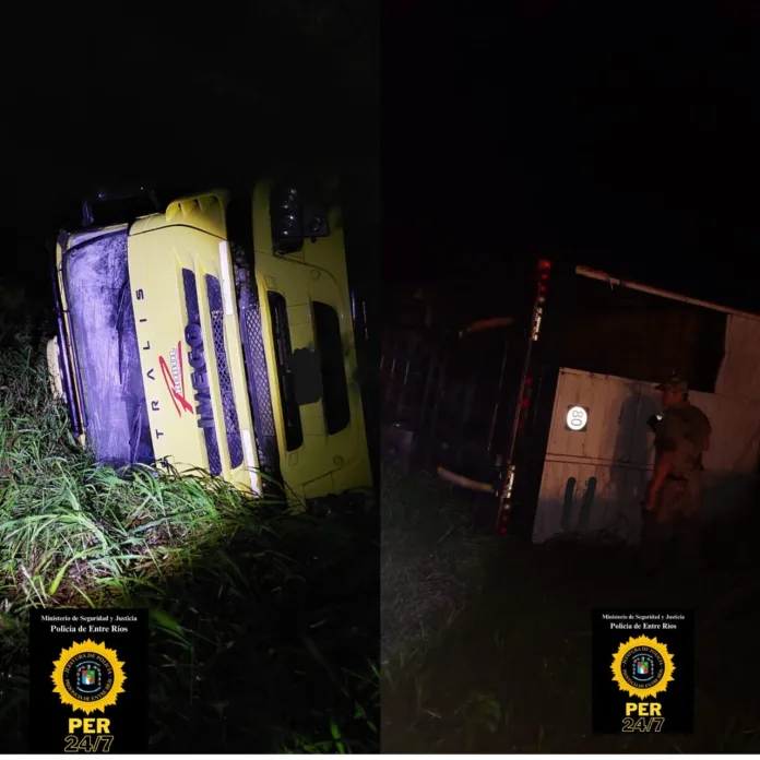 Presente los móviles en el lugar, se encuentran con un Camión Iveco Stralis, con semirremolque, cargado con 56 cabezas de ganado vacuno. El mismo era conducido por un ciudadano, de 25 años de edad domiciliado en BONPLAND, Provincia de Corrientes quien aduce que se dirigía por la Ruta antes mencionada sentido Norte a Sur y que con la escasa visibilidad pierde el control del rodado volcando en la banquina Oeste.
