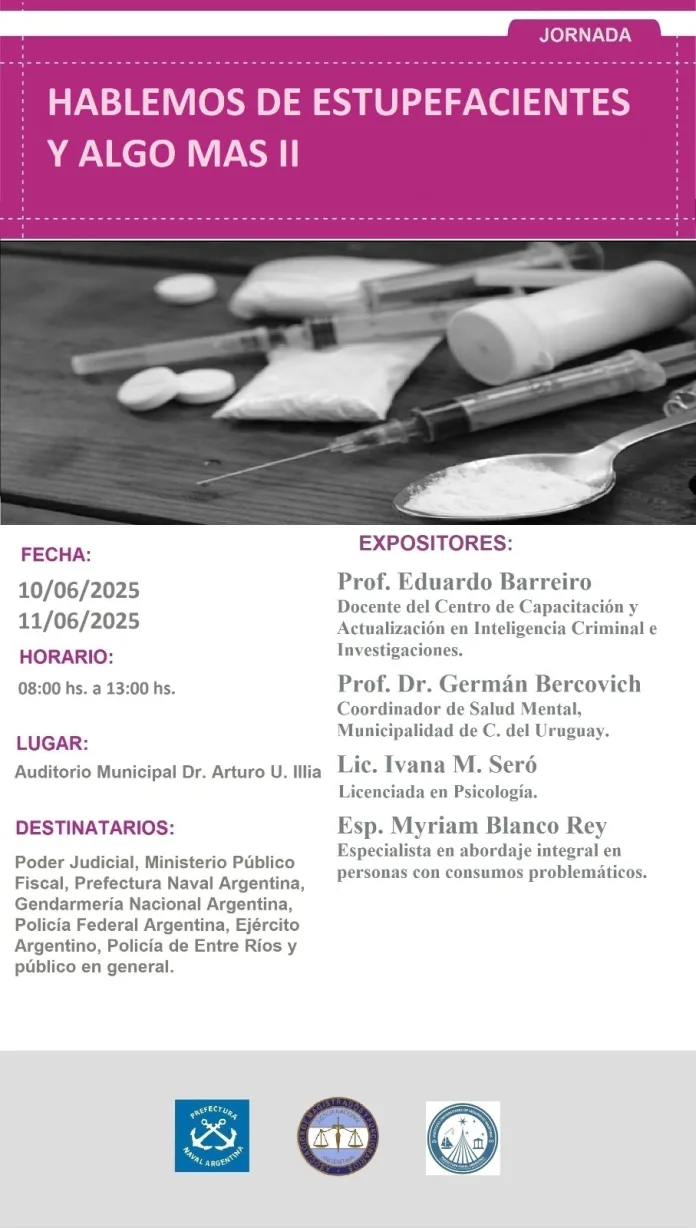 La Prefectura Naval Argentina, a través del Centro de Extensión Universitaria de Concepción del Uruguay con la adhesión de la Asociación de Magistrados de la Nación y la Secretaria de Salud Mental de la Municipalidad de Concepción del Uruguay, impulsa esta actividad abierta al público, con el objetivo de generar conciencia, brindar información y promover el debate responsable sobre el consumo problemático desustancias y sus implicancias sociales, legales y personales.