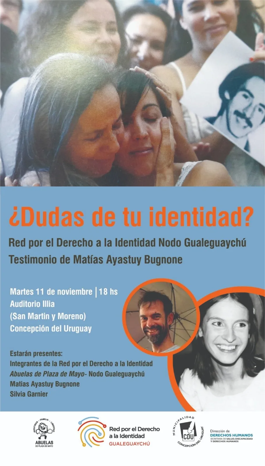 El martes 11 de noviembre a las 18 horas, en el auditorio municipal Arturo Illia, ubicado en San Martín y Moreno, se presentará la Red por el Derecho a la Identidad – Nodo Gualeguaychú. La actividad es organizada por la Dirección de Derechos Humanos de la Municipalidad de Concepción del Uruguay, junto a la Red por el Derecho a la Identidad Gualeguaychú y Abuelas de Plaza de Mayo.