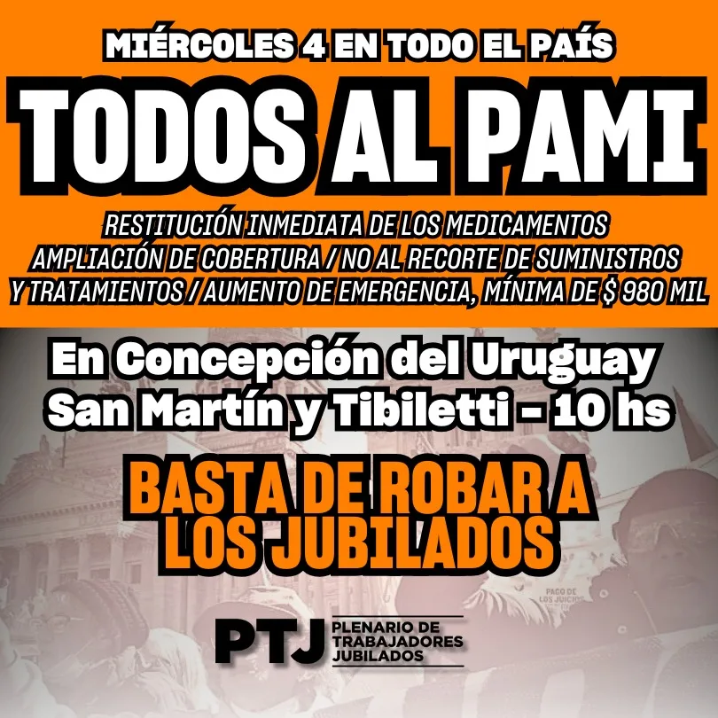El Gobierno Nacional ha decidido suprimir el descuento del 100% en la totalidad de los medicamentos que otorgaba el PAMI a jubilados y pensionados. Ante esta situación inadmisible, el Plenario de Trabajadores Jubilados y las organizaciones independientes de jubilados convocan a concentrarse frente al PAMI en todo el país, exigiendo la restitución inmediata de los medicamentos gratuitos. En Concepción del Uruguay, la convocatoria es frente a la agencia local del PAMI, ubicada en San Martín y Tibiletti, este miércoles 4 de diciembre desde las 10 hs.