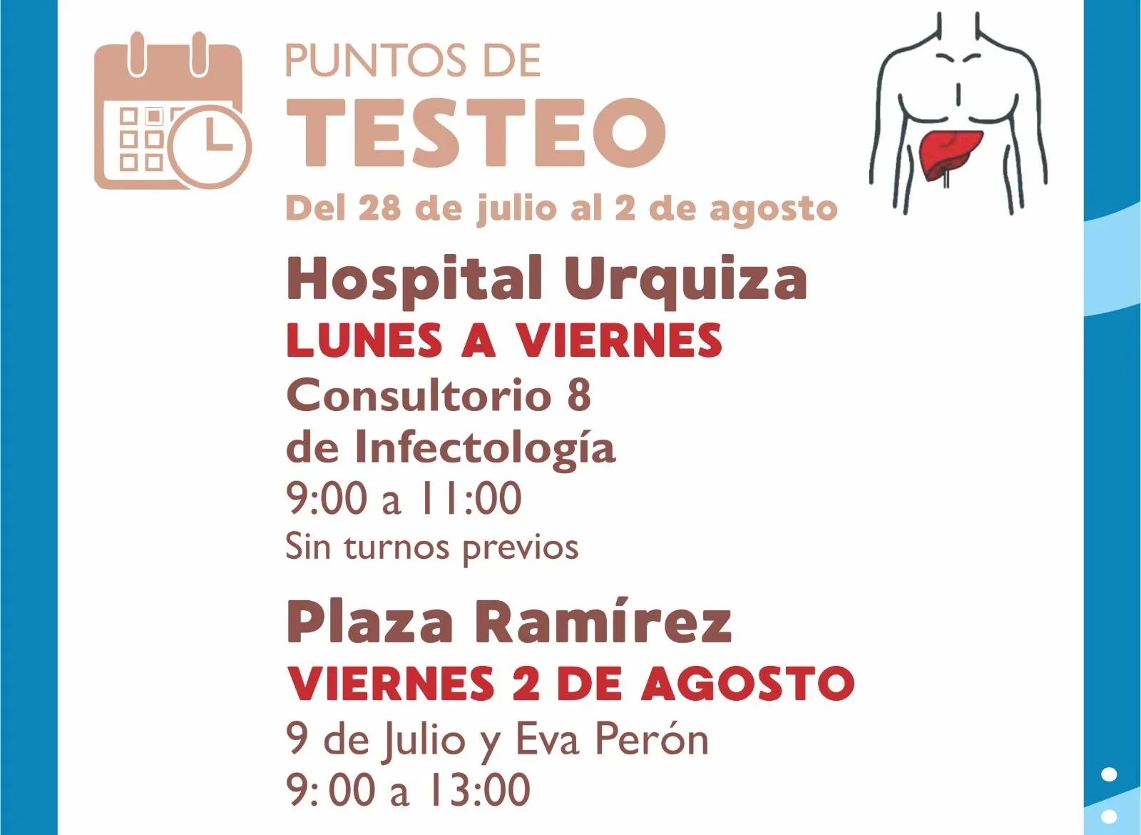 La agenda finalizará el viernes 2 de agosto con pruebas de detección precoz a realizarse en un puesto sanitario móvil, que se ubicará en la Plaza Ramírez, frente al Rectorado de la Universidad Nacional de Entre Ríos (UNER), sobre calle Eva Perón. Además, el equipo de enfermería de la Secretaría de Salud, Discapacidad y Derechos Humanos comenzará o completará esquemas de vacunación de Hepatitis B, donde estará presente la Dra. Lorena Notari, Especialista en Hepatología.