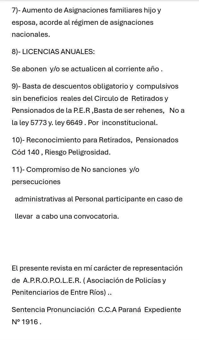 Uno de los puntos centrales del reclamo es la falta de participación en negociaciones salariales formales. Al no contar con sindicato, la Policía de Entre Ríos no integra mesas paritarias y queda sujeta a las decisiones que adopte el Poder Ejecutivo provincial.