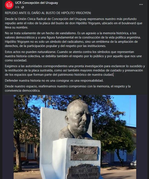 La Unión Cívica Radical de Concepción del Uruguay expresó su repudio tras el robo de la placa del busto de Hipólito Yrigoyen, ubicado en el boulevard que lleva su nombre.