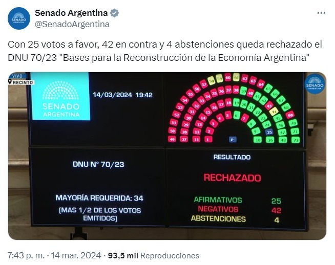 El Senado de la Nación rechazó este jueves el decreto de necesidad y urgencia (DNU) 70/2023 impulsado por el presidente Javier Milei. Se trata del mega proyecto, titulado Bases para la Reconstrucción de la Economía Argentina, que propone una serie de reformas en el Estado. La iniciativa registró 25 votos a favor y 42 en contra, así como cuatro abstenciones.