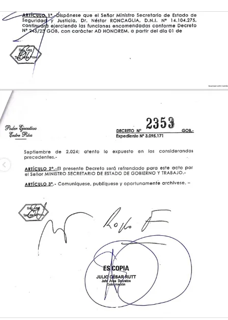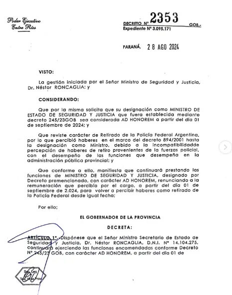 Mediante decreto N°2353 del Gobierno de Entre Ríos, se informó que el ministro de Seguridad y Justicia, Néstor Roncaglia, ejercerá sus funciones ad honorem, colaborando así con la reducción del gasto público.
