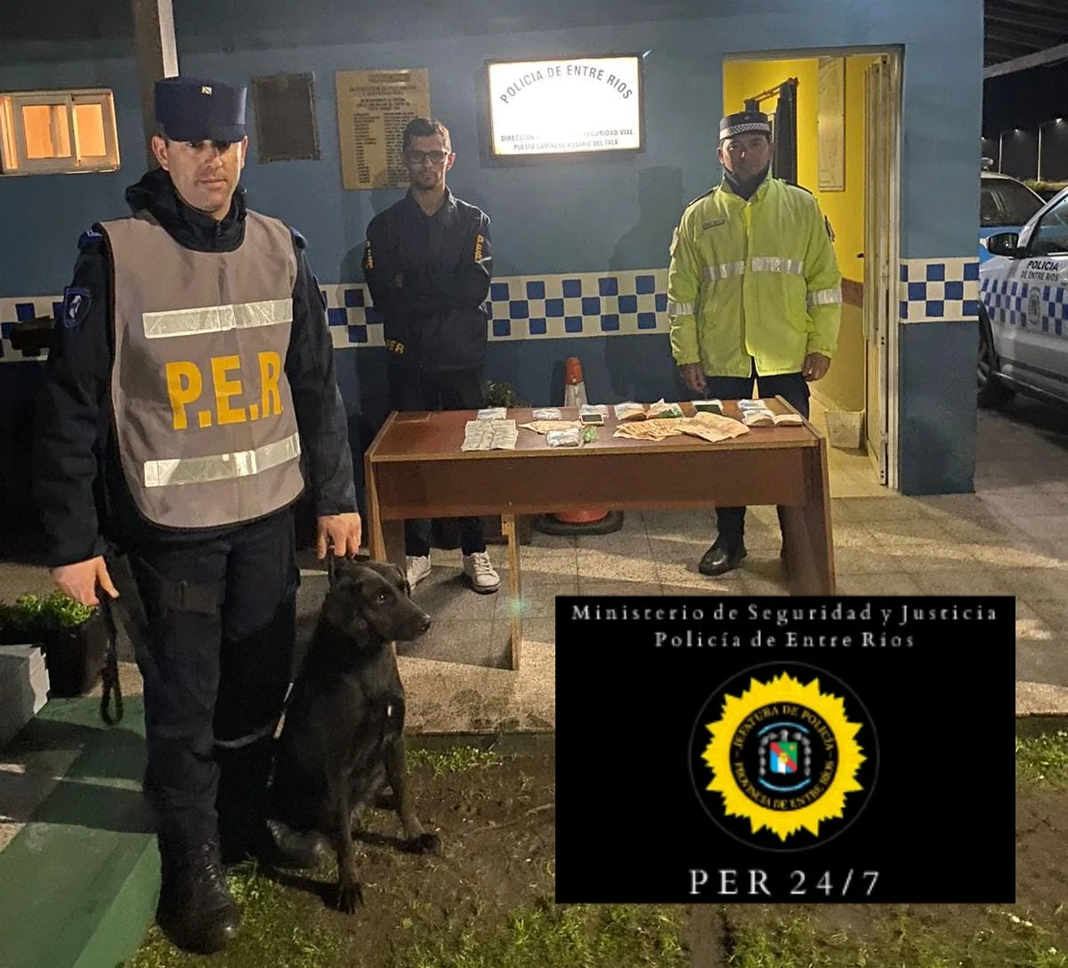 En el día de la víspera, pasadas las 20:00 Hs. Personal del Puesto Caminero Tala, dependiente de la Dirección Prevención y Seguridad Vial, en cruce de R. Nacional N° 12 y R. Prov. 39 y 6., en momentos que los uniformados se encontraban realizando controles de rutina, detienen la marcha de un vehículo, Volkswagen, modelo Gol Trend, color blanco, en el cual viajaban dos masculinos mayores de edad, los cuales a diferentes preguntas de rutina, manifestaron un comportamiento nervioso y se mostraron esquivos a la situación. Esta actitud llamó la atención al personal policial que cumplía funciones en dicho puesto. Por lo que solicitan la colaboración funcional del personal de la División Toxicología. Presentes en el lugar con el Can detector de estupefacientes “SOFI”, quien, al pasaje, realiza el marcaje en zona del baúl del automóvil. Por lo que se procede al secuestro de los siguientes elementos: