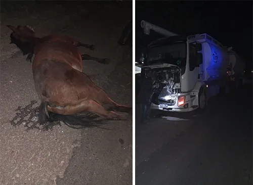 Durante la madrugada de este lunes, se produjo un accidente de tránsito en ruta 39 frente a metalúrgica Bonnet, a escasos metros del puesto de Vialidad Nacional de la localidad de Basavilbaso, en el lugar se constata que un camión Marca Volvo, modelo 330, color blanco, con chasis y acoplado cargado por alimento balanceado, de la empresa Fadel, conducido por un hombre de 50 años, el cual habría colisionado dos equinos que se encontraban sobre la cinta asfáltica, producto de la colisión uno de los equinos (yegua) pelaje color marrón, sin marca visible, muere en el lugar quedando sobre la banquita sur sin entorpecer el tránsito vehicular mientras que el otro equipo siendo una yegua pelaje color blanco quedó golpeada pero sin lesiones de gravedad visibles, la segunda sin marca visible, en cuanto al vehículo resultó con daño en su parte frontal y su conductor no presentaba lesiones, dicho rodado estacionado sobre la banquita sin entorpecer el tránsito vehicular, aclarando que el rodado habría salido de la localidad de San Justo teniendo como destino la localidad de villa San marcial.