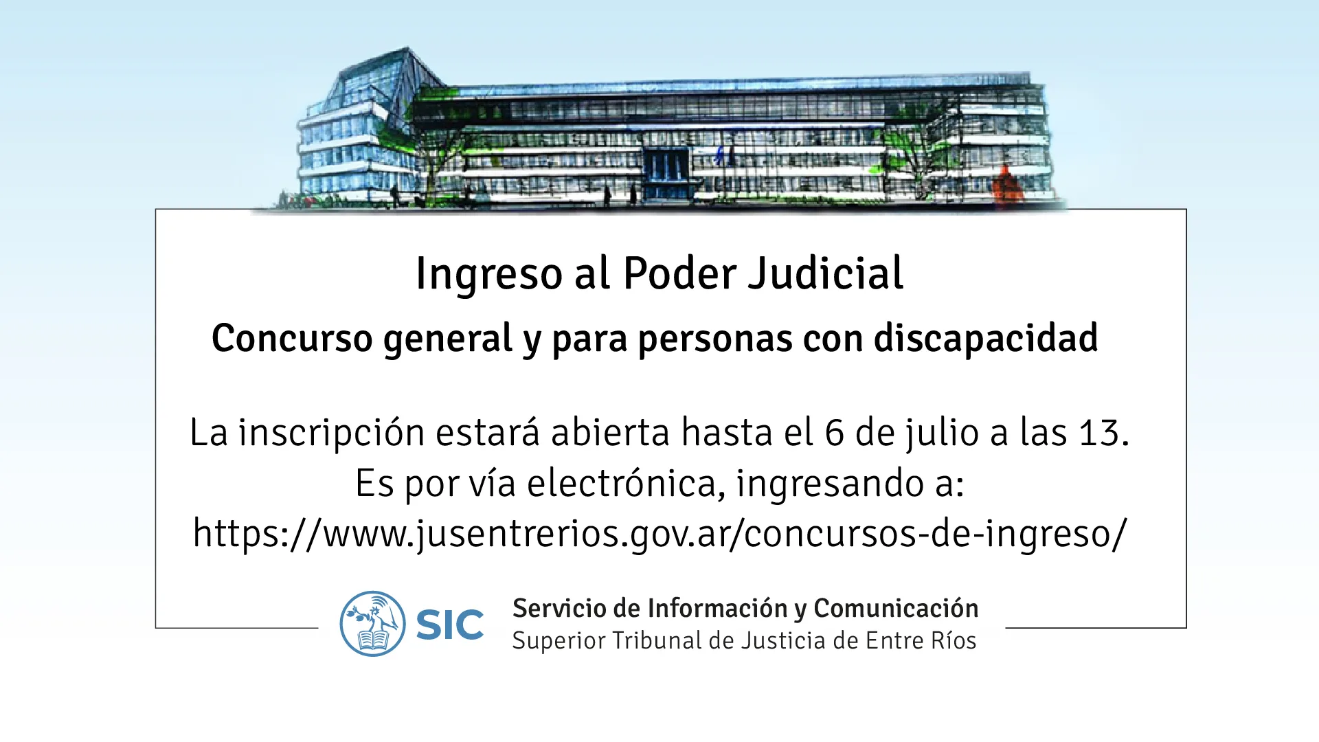 La inscripción comenzó hoy y se extenderá hasta el 6 de julio venidero hasta las 13 hs. El formulario se encuentra habilitado y el trámite es vía electrónica. El Superior Tribunal de Justicia de Entre Ríos (STJER) convocó a concurso abierto de antecedentes y oposición para el ingreso como escribiente al Poder Judicial de Entre Ríos y el llamado contempla también a las personas con discapacidad.