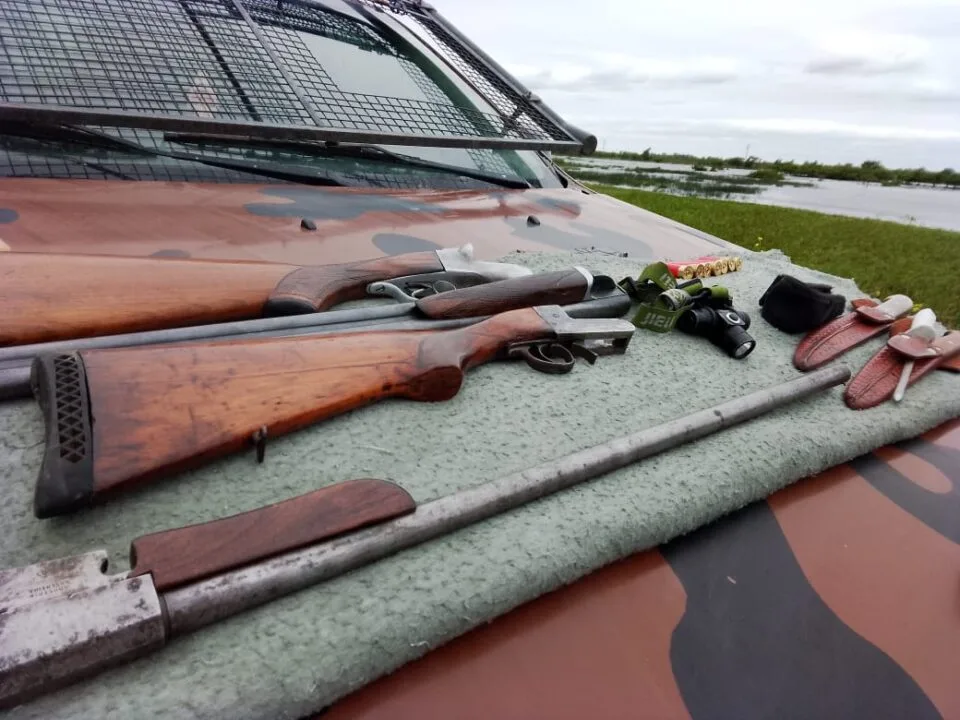 Previa consulta con la Fiscalía interviniente a cargo del Dr. Gastón Popelka, por carecer los causantes de la documentación legal respaldatoria, se procedió al formal secuestro de dos armas de fuego, tipo escopeta, ambas Cal. 16 y cartuchería del mismo calibre.