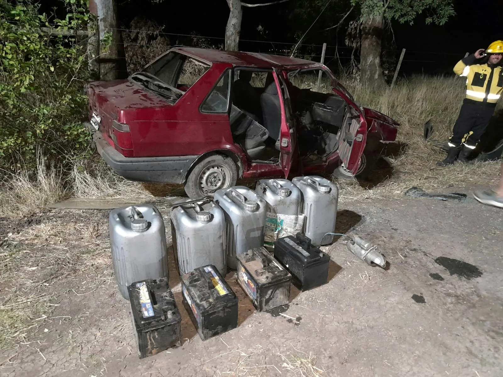 En la madrugada de este domingo, personal de Comisaría Arroyo Barú, a raíz de tomar intervención en un despiste en camino vecinal de colonia Maipú, lugar donde se encontró un Fiat Duna, que momentos antes iba conducido por un masculino de 35 años que iba en compañía de su hijo de 12. Constatan e Inician actuaciones de oficio a raíz visualizar dentro del rodado cinco bidones de 20 litros conteniendo gasoil, cuatro baterías, un motor de arranque y una llave francesa, elementos que fueron sustraídos en un campo ubicado en inmediaciones del accidente y que fueron reconocidos por su propietario. Se informa lo acontecido a la Unidad Fiscal de Colón y se realiza el formal secuestro de los bienes encontrados, quedando supeditado a la causa el sujeto de 35 años que iba a bordo del vehículo accidentado