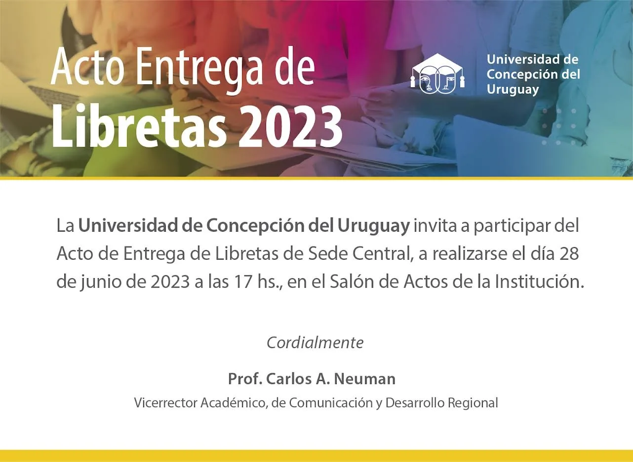 Se hará el acto de entrega de libretas 2023 en la Universidad de Concepción del Uruguay. La ceremonia será este miércoles 28 a las 17:00 horas en el Salón de Actos.