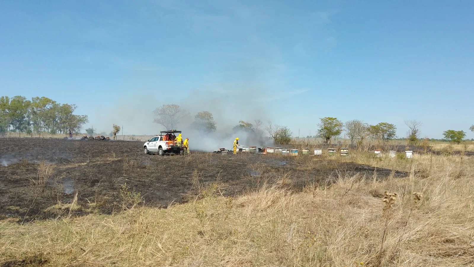Llegado personal policial al lugar del hecho se solicita la presencia de bomberos voluntarios San Salvador ya que el foco ígneo habría afectado el total de una hectárea de campo abierto consumiendo cuatro cajones de colmena y cinco rollos de fardo, por testigos del hecho el inicio del fuego fue de procedencia natural por las altas temperaturas.