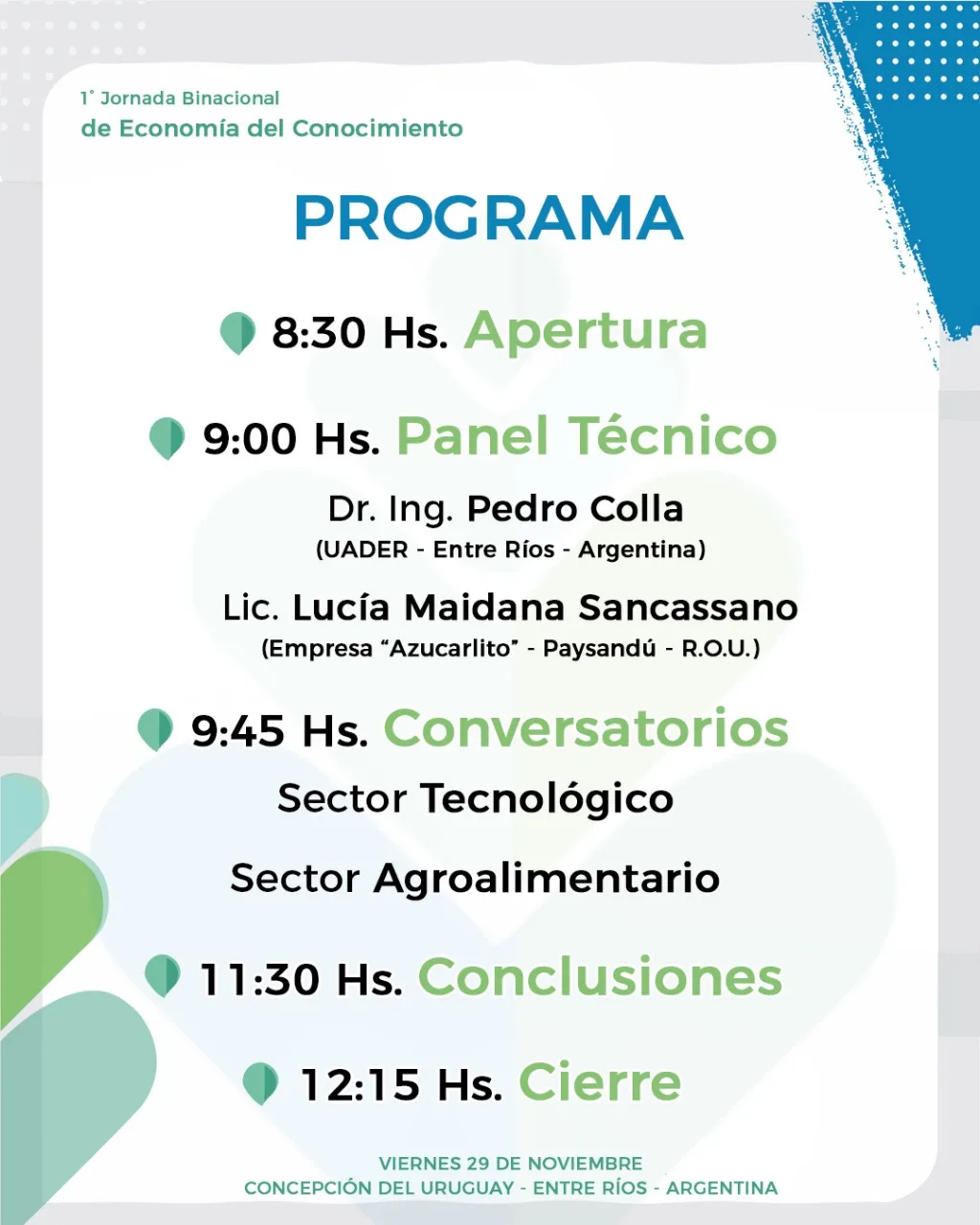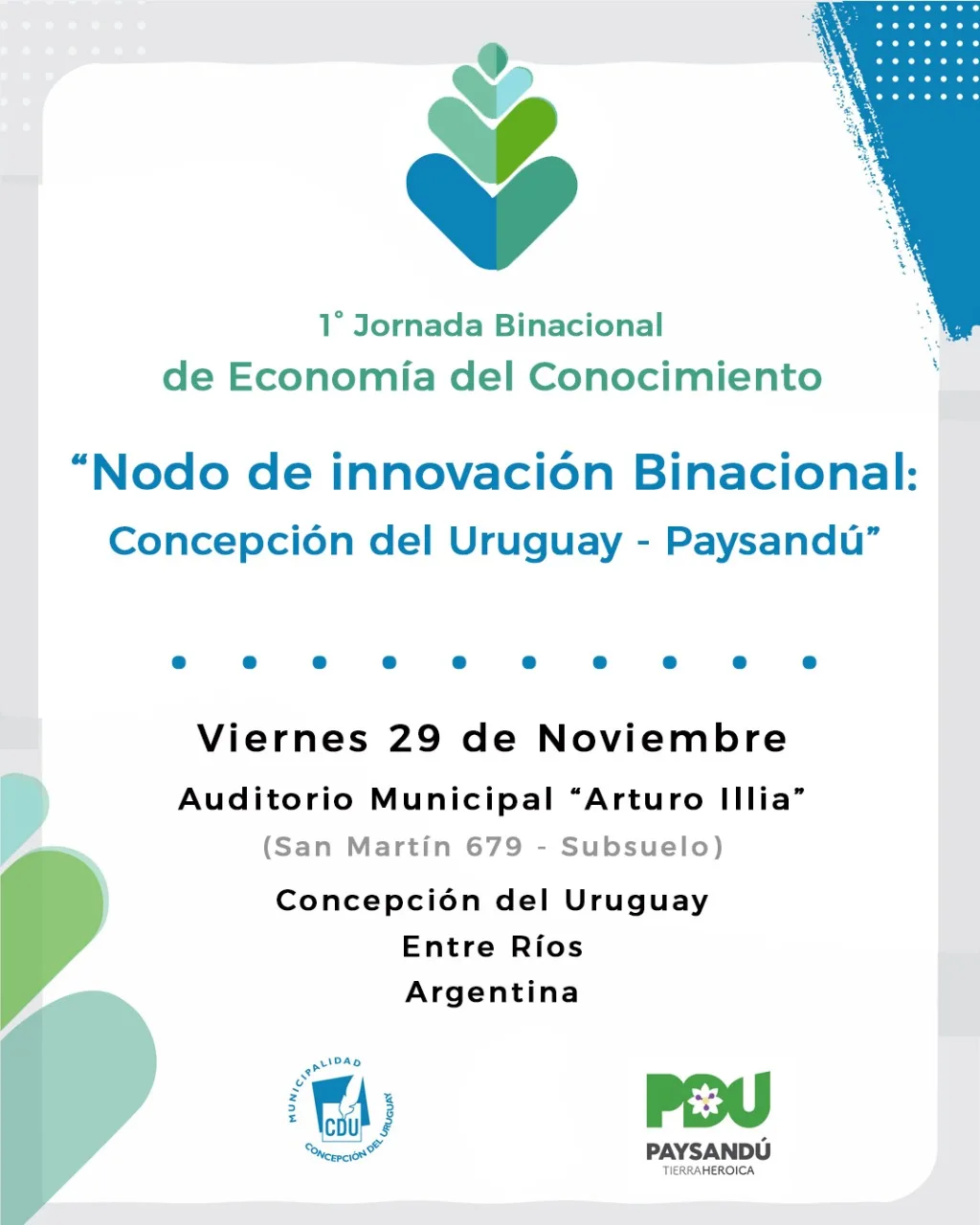 La Municipalidad de Concepción del Uruguay y la Intendencia Departamental de Paysandú invitan a participar de la 1° Jornada Binacional de Economía del Conocimiento, que se llevará a cabo el próximo viernes 29 de noviembre, a las 8:30 horas en el Auditorio Municipal «Arturo Illia».