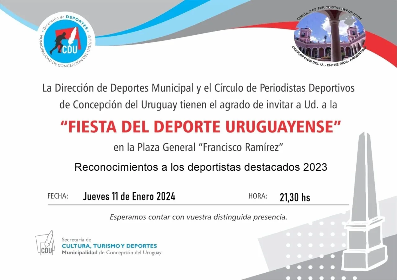 Este próximo jueves 11 de enero, se realizará la tradicional “Fiesta del Deporte Uruguayense”, que tendrá lugar en la Plaza General Francisco Ramírez a las 21:30 horas.