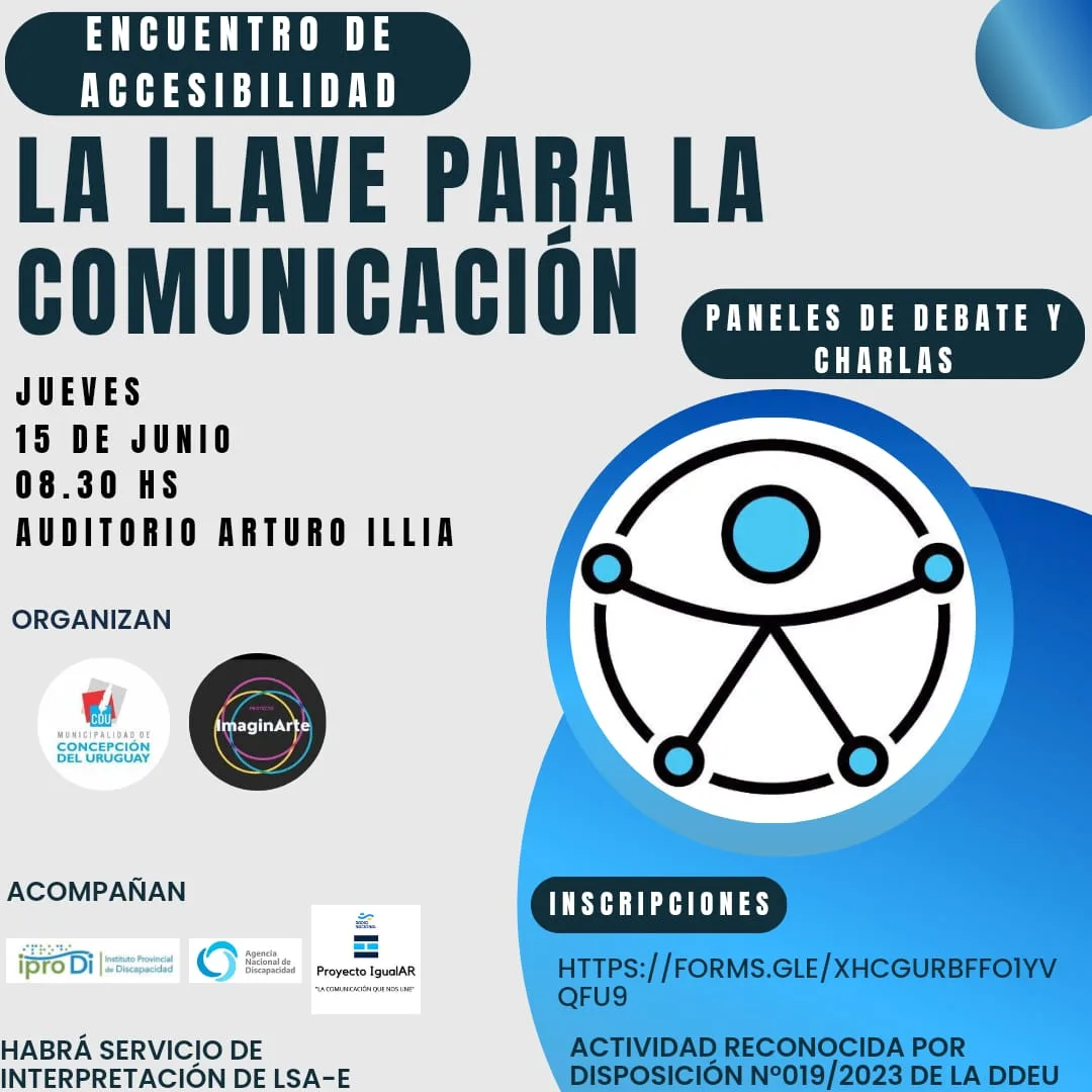 El Encuentro se denomina “Accesibilidad: la llave para la comunicación”. Este evento cuenta con el acompañamiento de destacadas instituciones, entre ellas, la ANDIS (Agencia Nacional de Discapacidad); IPRODI (Instituto Provincial de Discapacidad); el Proyecto IgualAR de Radio Nacional y la Municipalidad de Concepción del Uruguay.