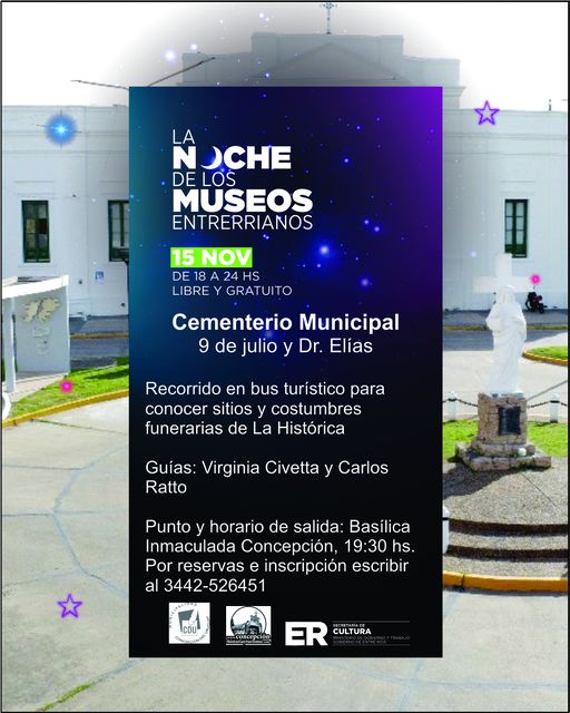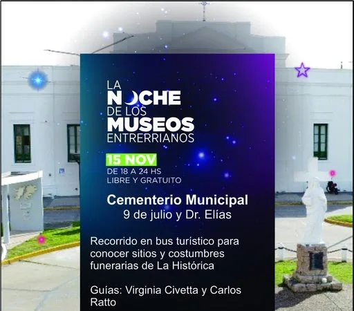 El próximo viernes 15 de noviembre, el Cementerio Municipal de Concepción del Uruguay participará de la tradicional Noche de los Museos con una propuesta inédita y muy especial: el primer recorrido en Bus Turístico por los sitios históricos y las leyendas funerarias de la ciudad. Este evento será una oportunidad única para conocer las curiosidades y secretos de la historia local, guiado por los expertos Virginia Civetta y Carlos Ratto.