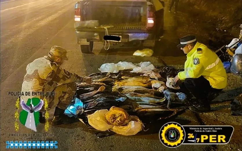Efectivos de Caminera Concordia detuvieron la marcha de una pick-up Toyota Hilux en la que viajaban cinco personas. Durante el control de documentación y rodado, se constató que transportaban más de 120 kilos de pescado de las especies Surubí y Dorado, de los cuales solo una pieza respetaba las medidas reglamentarias, y 40 kilos de carne de cerdo jabalí faenada y trasladada de forma irregular.