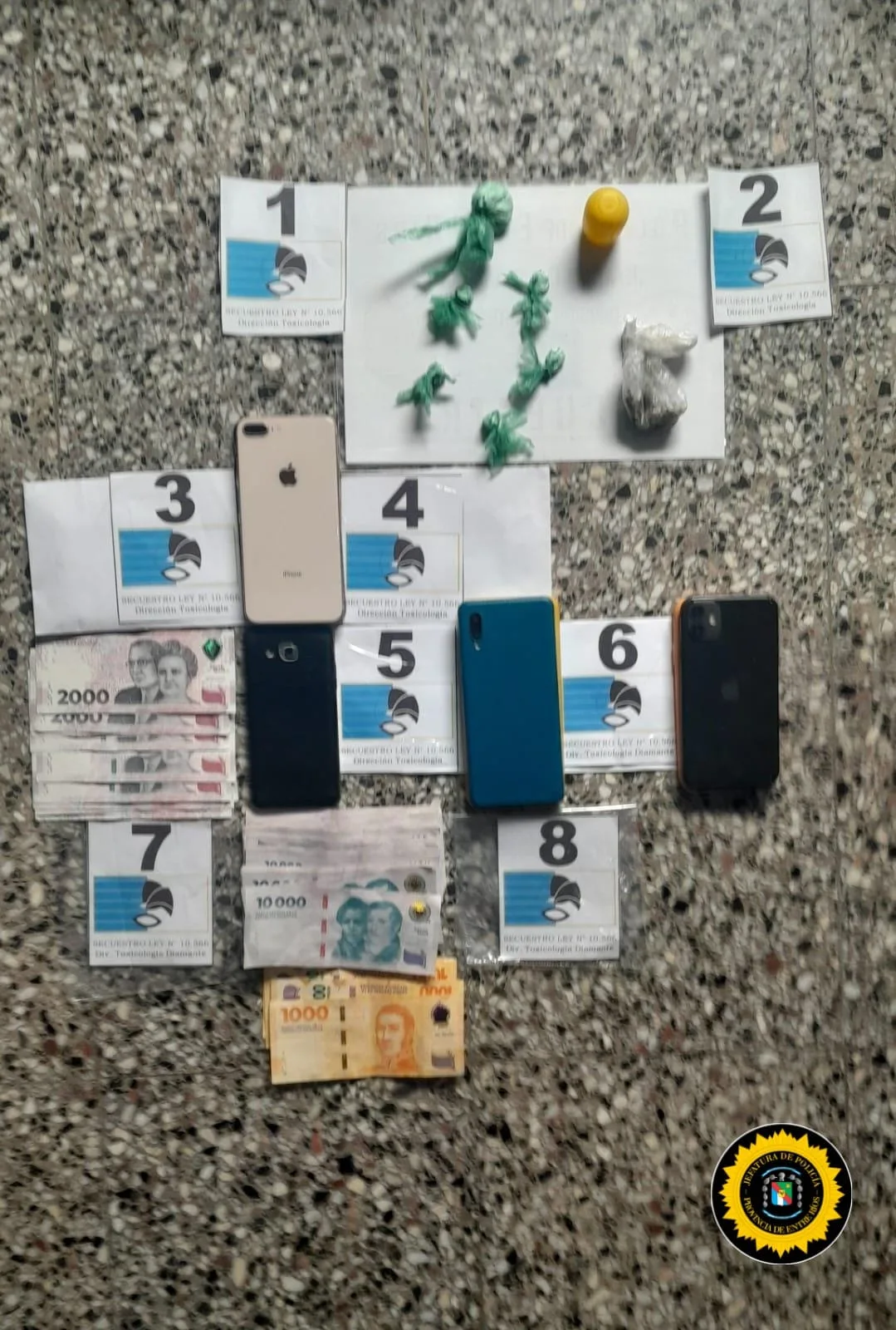 Las diligencias fueron solicitadas por el Ministerio Público Fiscal, bajo la dirección de la Dra. Micaela Calgaro, y resultaron en la detención de tres hombres y la identificación de 16 personas mayores de edad, de ambos sexos. Entre los elementos secuestrados se destacan un automóvil Volkswagen Gol y una motocicleta Skua 150cc, propiedad del principal investigado. También se incautó una suma aproximada de 800.000 pesos en efectivo, varios envoltorios de nylon con cocaína y marihuana, listos para la venta al menudeo, semillas de cannabis sativa, anotaciones relevantes para la investigación y un total de 11 teléfonos móviles.