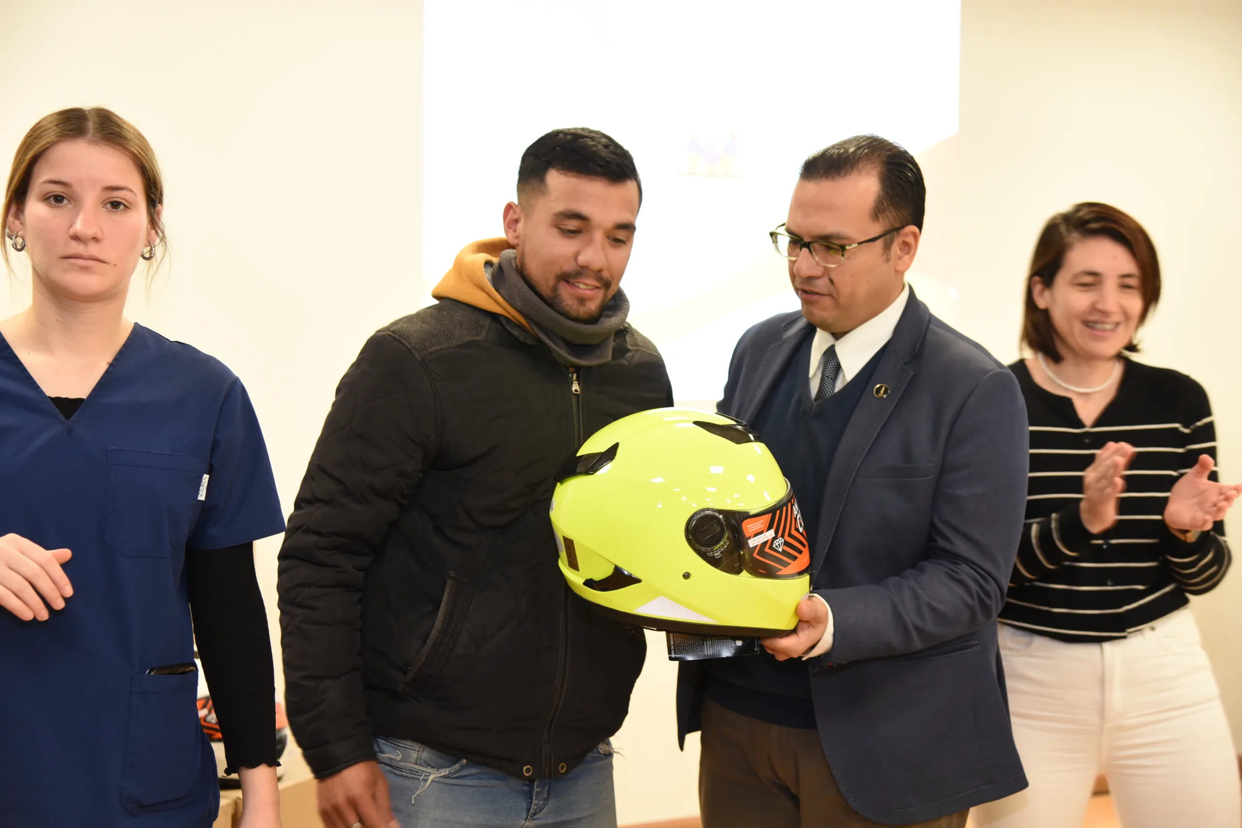 En este sentido, la acción consistió en entregar más de 70 cascos a estudiantes de universidades locales y personas que trabajan como moto-mandados.