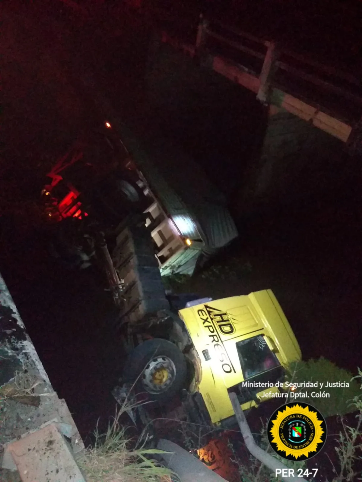 Un impactante siniestro vial se registró durante la noche en el kilómetro 199 de la Autovía José Gervasio Artigas, cuando un camión de encomiendas perdió el control, atravesó el cantero central y terminó cayendo desde un puente, quedando detenido bajo la estructura.