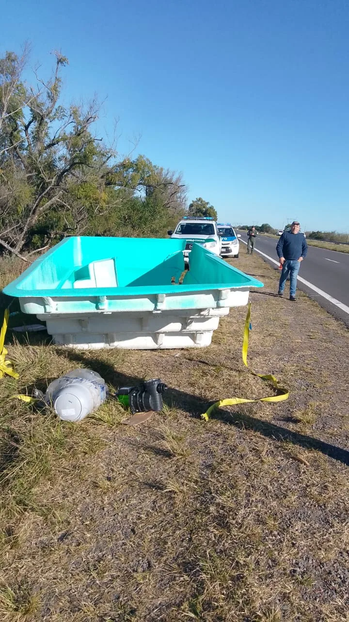Un insólito siniestro vial tuvo lugar cerca de las 14:45 horas en el kilómetro 140 de la Autovía Nacional N°12, mano Buenos Aires a Entre Ríos. El hecho involucró a dos vehículos y terminó con uno de ellos fuera de la calzada tras chocar contra una pileta de natación que cayó desde otro rodado en movimiento.