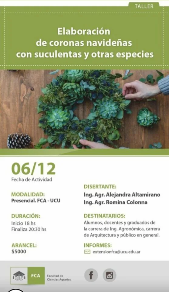 La Facultad de Ciencias Agrarias de la Universidad de Concepción del Uruguay llevará a cabo una taller de elaboración de coronas navideñas con suculentas y otras especies. Será el miércoles 6 de diciembre de 18:00 a 20:30 horas, en la sede de la institución, en 8 de Junio 522.