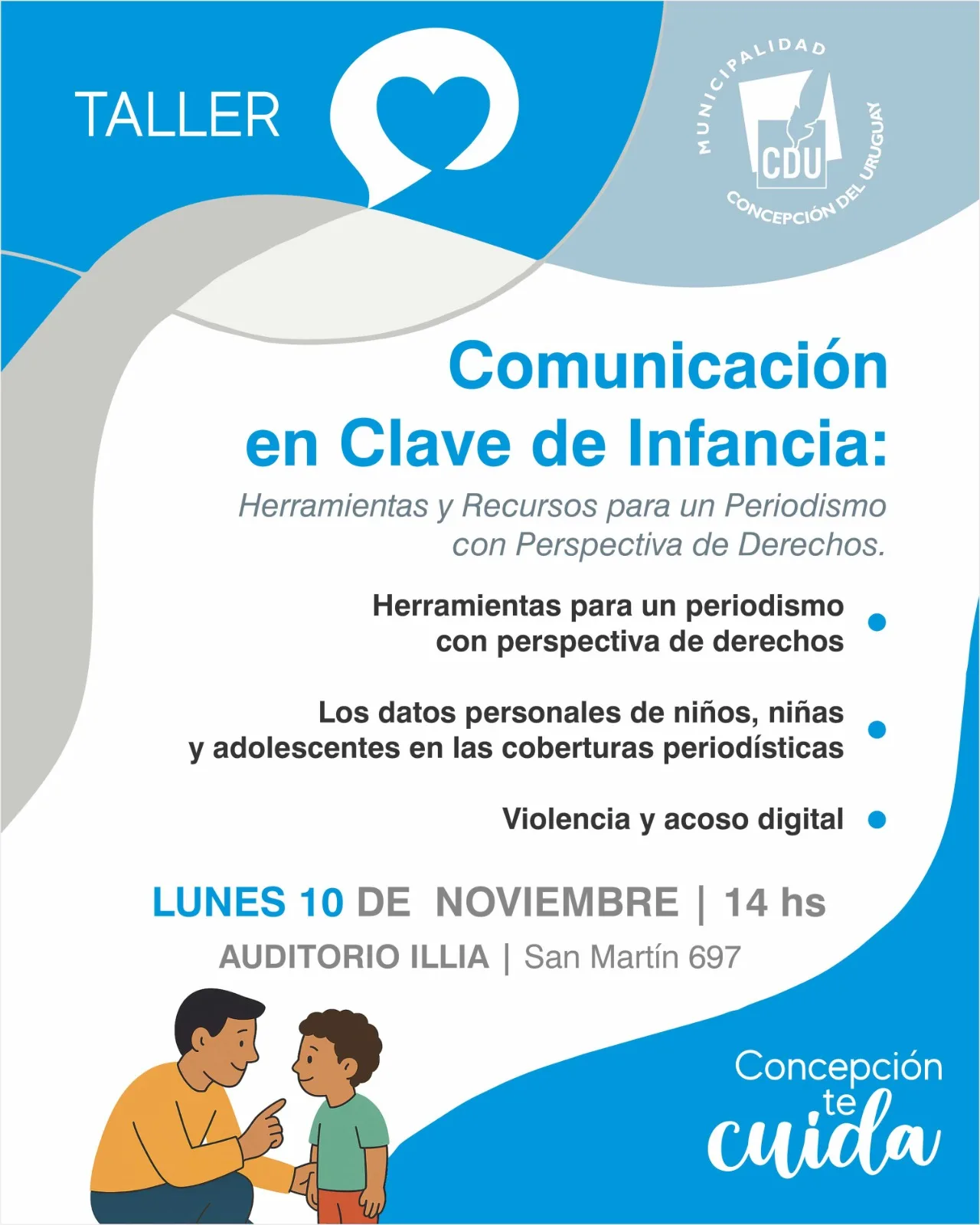 Durante el taller se abordarán temas como Estrategias para cobertura mediática sobre niñez y adolescencia; Resguardo de datos personales de niños, niñas y adolescentes en coberturas periodísticas; y Violencia y acoso digital.