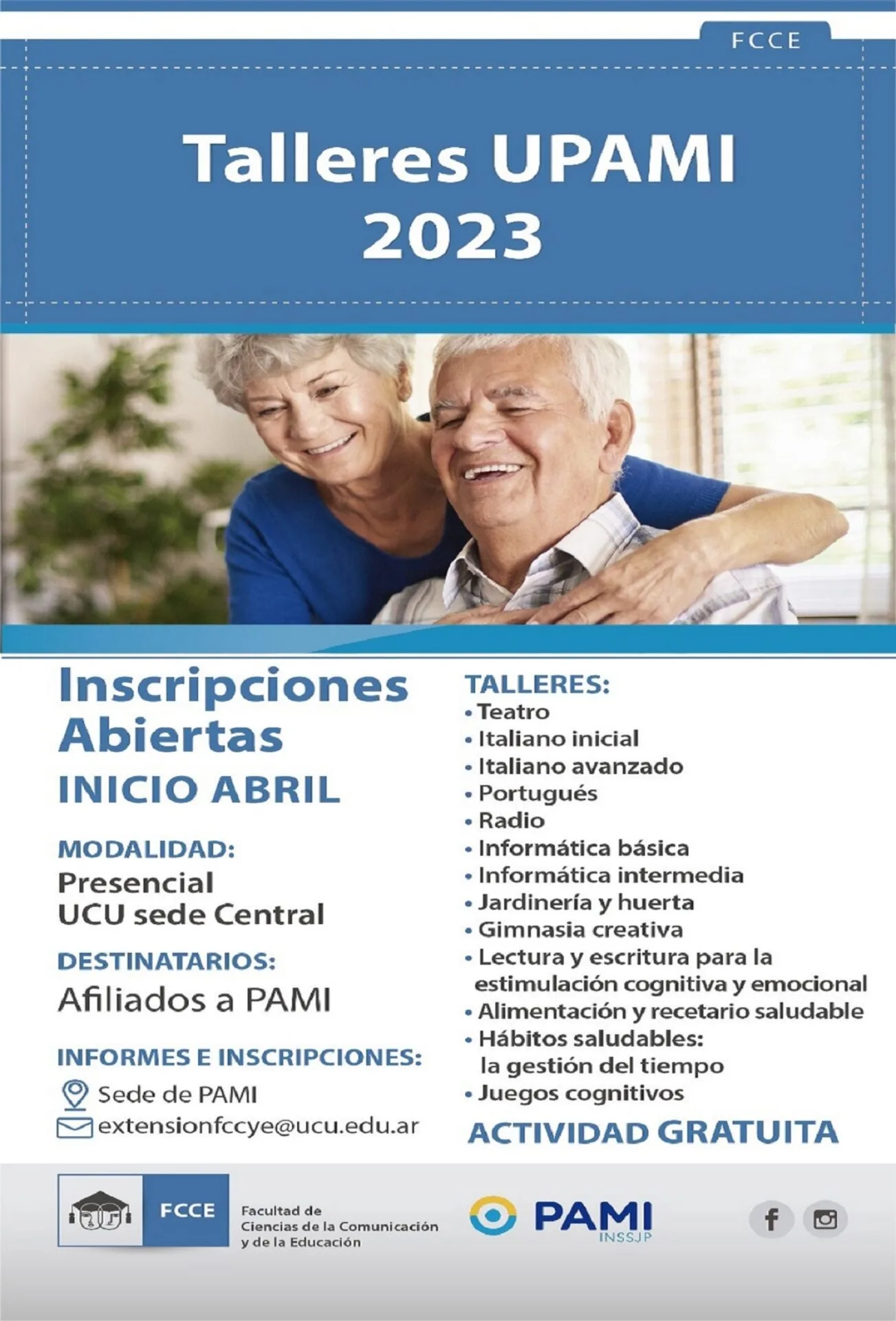 PAMI y la Universidad de Concepción del Uruguay, comenzaron los talleres del Programa UPAMI (Universidad Para Adultos Mayores Integrados). La inscripción continúa abierta para los afiliados que quieran participar de cualquiera de los siguientes talleres: