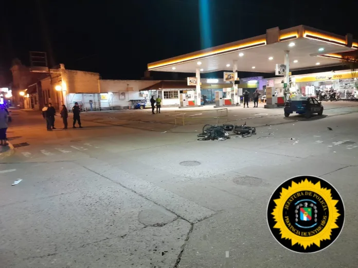 En la noche de ayer, alrededor de las 23:10 horas, un grave siniestro vial ocurrió en la intersección de calle España y calle Piaggio, donde dos motocicletas —una Motomel de 125 cc y una Honda Wave de 110 cc— que circulaban en paralelo, colisionaron contra un automóvil Renault Mégane conducido por un hombre de 46 años.