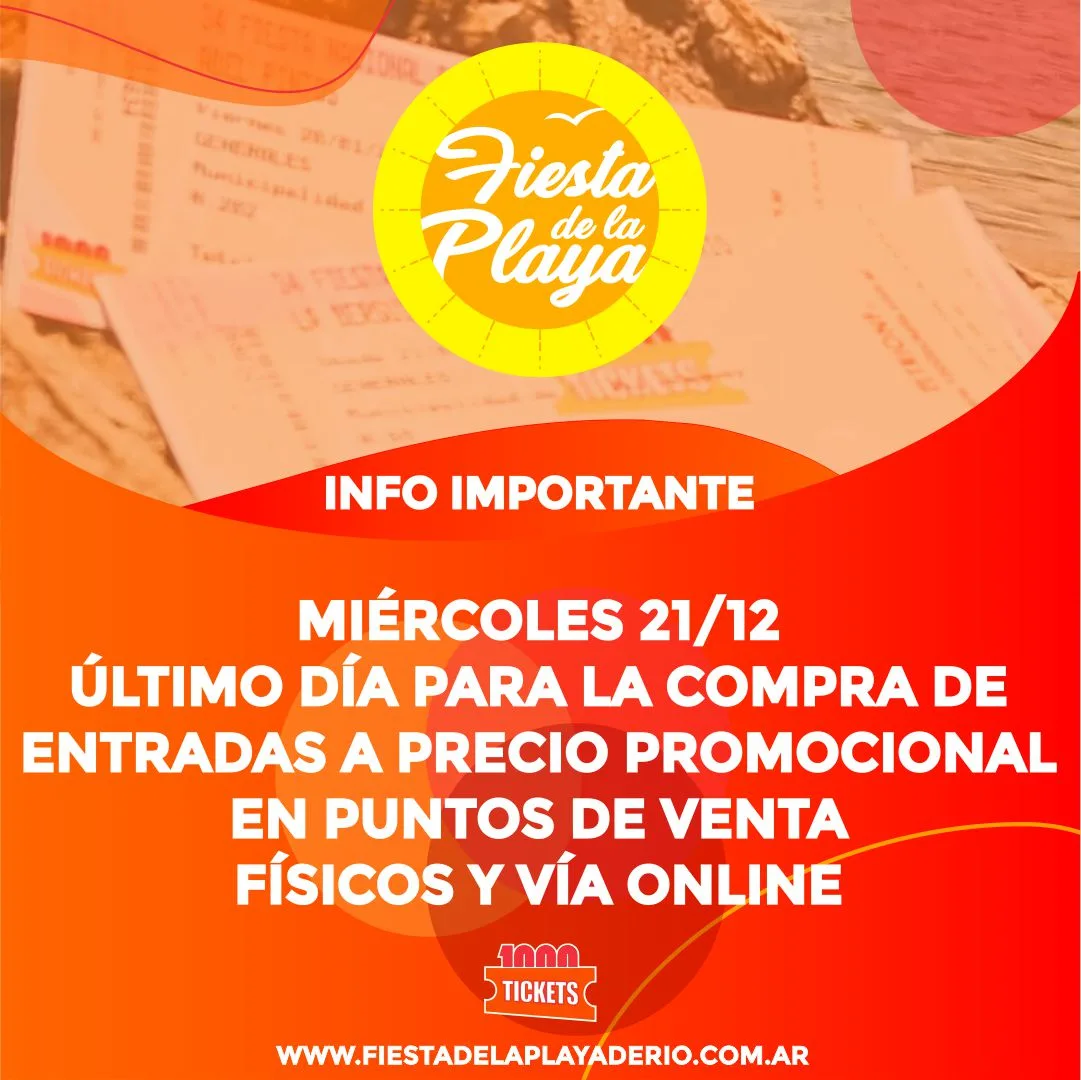 La Comisión Organizadora de la Fiesta Nacional de la Playa dispuso en esta edición que el costo de las entradas anticipadas tengan un valor más bajo para los primeros compradores. Por lo tanto, este miércoles 21 de diciembre será el último día para comprar entradas a precio promocional.