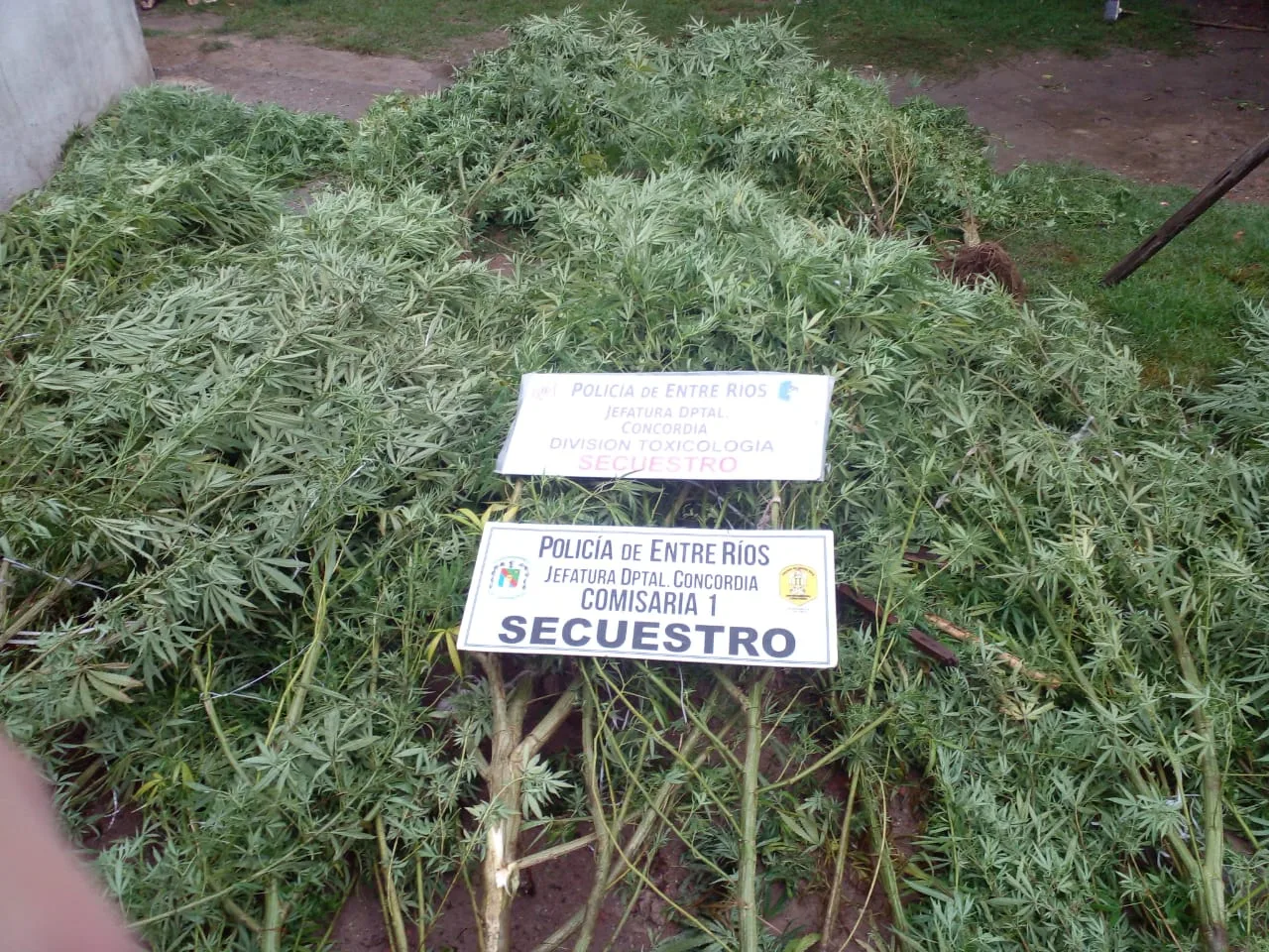 En la tarde de hoy, personal de la División Toxicología Concordia de esta Jefatura Departamental, procedió a realizar un allanamiento en un domicilio de la Zona Sur de Concordia en cercanías a la Defensa Costera, donde se procedió al secuestro de treinta y cuatro (34) plantas de una sustancia vegetal verde sospechadas como Cannabis Sativa que miden entre 1.70 mts y 4 mts. de altura, en macetas con tierra y también cogollos disecados y ramas en proceso de secado. Elementos que fueron resguardados y secuestrados por personal idóneo previa prueba de los reactivos químicos que revelaron un resultado Positivo para la sustancia estupefaciente de Cannabis Sativa. De todo lo actuado en el lugar, se le informó al Dr. Fabio Zabaleta de la Unidad Fiscal Especializada en Narcomenudeo, quien ordenó la Detención de cinco personas mayores de edad, (3 Masculinos y 2 Femeninas).