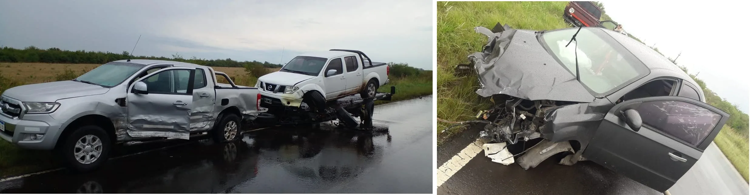 Según informado a este medio por fuentes oficiales. Por razones que se tratan de establecer un vehículo Marca Chevrolet Aveo, que circulaba sur-norte, conducido por una femenina mayor de edad. Ésta pierde el control bajo una tenue llovizna, se cruza de carril, impactando del lado izquierdo a una Ford Ranger, conducida por un masculino mayor, dicho vehículo llevaba un carromato, perteneciente a un servicio de grúa de la ciudad de Basavilbaso, que estaba auxiliando a otra camioneta, una Nissan Frontier, que también sufrió daños materiales.