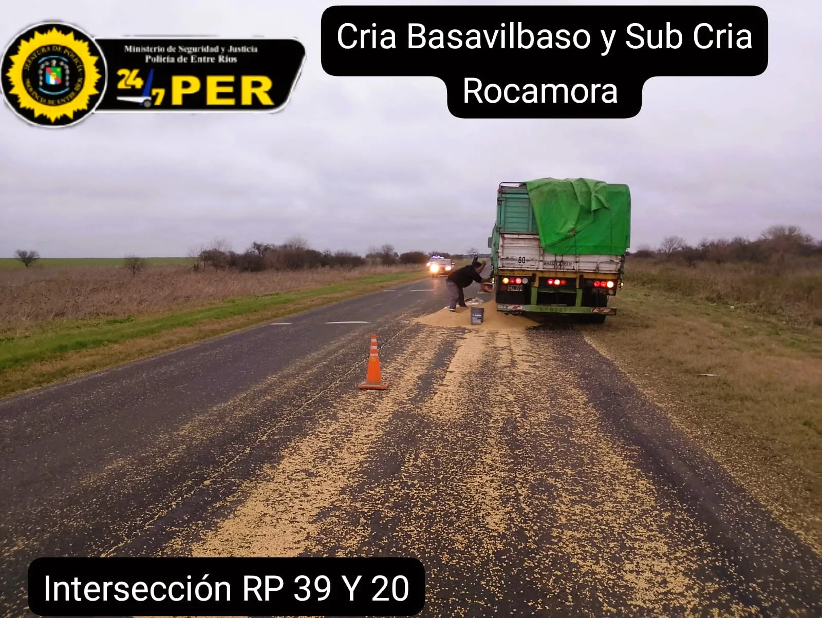 En la tarde de hoy, un incidente en la Ruta Provincial 39, a un kilómetro al oeste del cruce con la Ruta Provincial 20, provocó una interrupción parcial en la circulación vehicular. Un camión Mercedes Benz 1633, perteneciente a una empresa de alimentos de San Salvador, sufrió la apertura de la puerta trasera del acoplado, lo que ocasionó el derrame de soja sobre la calzada.