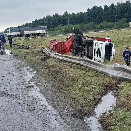 En la mañana de hoy se produjo un siniestro vial, por el despiste en el Km 302 donde por razones que se tratan establecer un Camión Fiat Iveco, color blanco, con acoplado marca Lambert, de la Localidad de Chajarí, conducido por un masculino de 38 años, con domicilio en Barrio San Clemente – Chajarí, quien circulaba por la Autovía Nacional N° 14 de Sur a Norte, despista hacia la banquina lado derecha, quedando volcado sobre uno de sus lado, el camión iba cargado con cajones de citrus vacío, el conductor no resultó con lesiones.