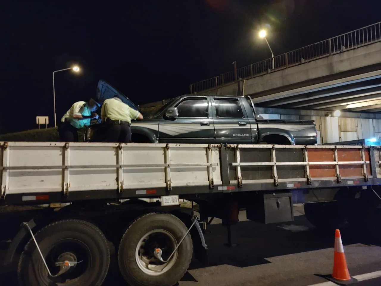 Personal apostado en dicho control, logra detener la marcha de un camión marca Volvo, modelo NL10 340 con dominio extranjero, en el cual se trasladaban dos hombres mayores, de nacionalidad argentina, domiciliados en la localidad de Paso de los Libres, provincia de Corrientes. Remolcando semirremolque marca Facchini, también con dominio extranjero, sobre el cual se transportaba una pick up marca Toyota, modelo Hilux con dominio colocado nacional.