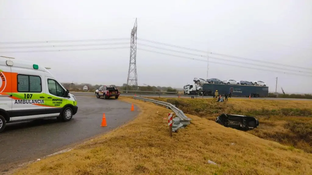 A las 10:53 horas de hoy, se informó sobre un siniestro vial en el kilómetro 1 de la Autovía N° 14, en dirección de Buenos Aires a Entre Ríos. Un automóvil chocó contra el guardarraíl y posteriormente volcó en la zona de bañado. Las unidades de rescate móvil 19 se dirigieron al lugar, donde encontraron a los ocupantes siendo asistidos por personal de la ambulancia del Hospital Eva Duarte de Ceibas.