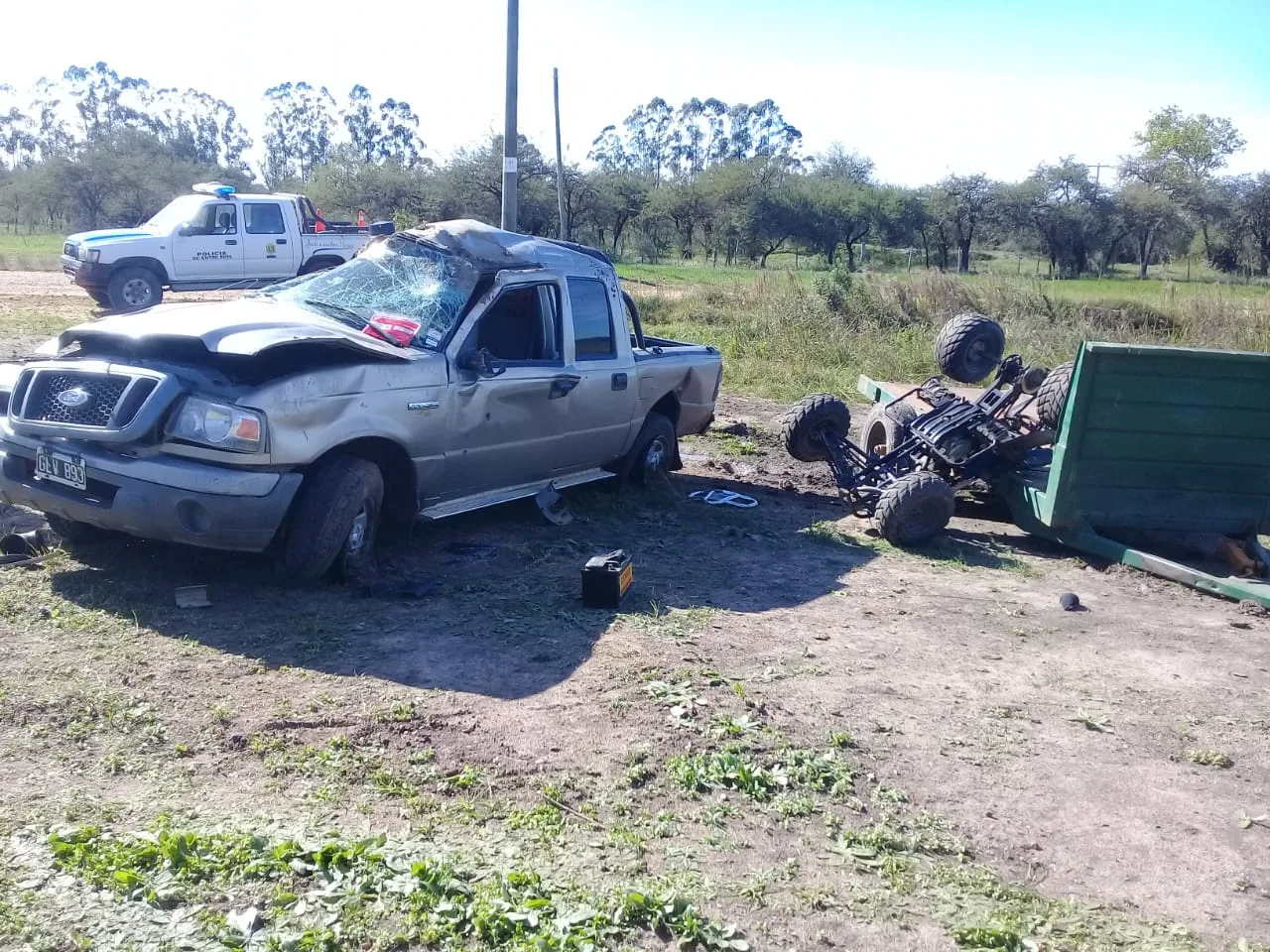 En el lugar se pudo constatar que el mismo se produjo por un solo vehículo, una camioneta marca Ford, modelo Ranger, tipo Pick Up; la cual llevaba un carro con un cuatriciclo marca Mondial en la parte superior. El conductor del vehículo un masculino mayor de edad, con domicilio sobre Avenida 25 de mayo y calle N 7 de la localidad de Villa del Rosario, quien fue trasladado en ambulancia hasta el hospital Santa Rosa de Chajarí.