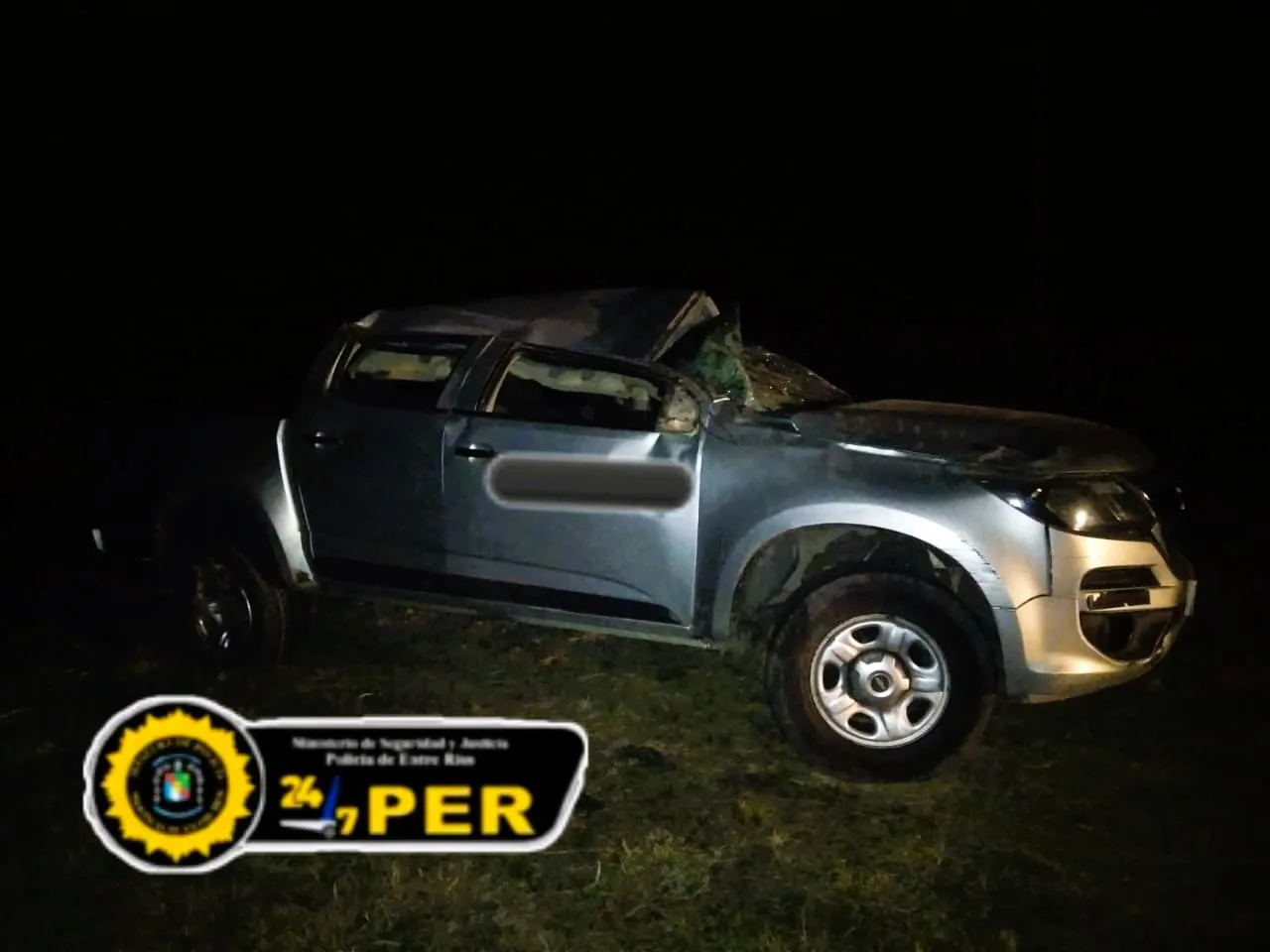 A las 21:00 horas del día de ayer, personal de la Dirección Prevención y Seguridad Vial fue alertado sobre un vuelco ocurrido en la Ruta Nacional N° 12, a la altura del kilómetro 310. Al llegar al lugar, efectivos de la Comisaría Sola encontraron una camioneta Chevrolet S-10, con inscripción de una empresa en el lateral, volcada y sin ocupantes.