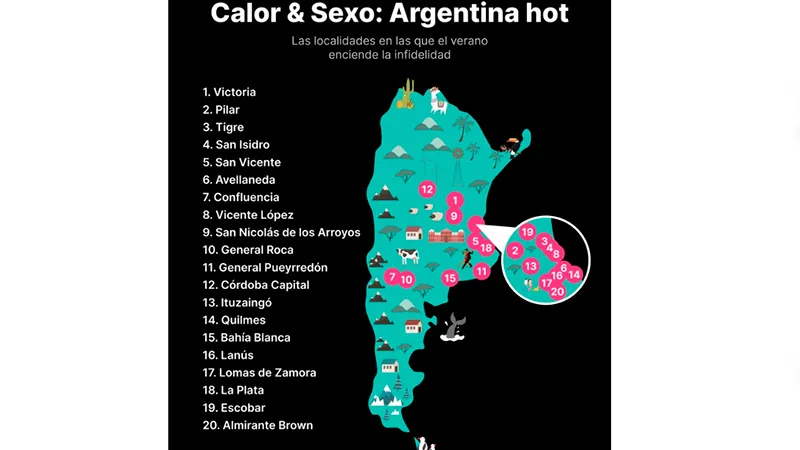 De acuerdo al número de registros en Ashley Madison entre el 1° de octubre de 2022 y el 28 de febrero de 2023 en Argentina, estos son los veinte lugares «más infieles» durante la temporada estival: