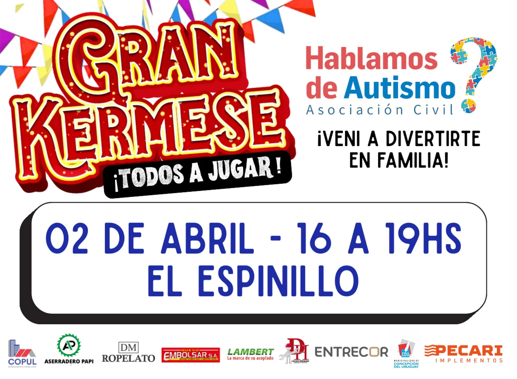 El 2 de abril será el Día Mundial de la Concientización sobre el Autismo, por lo cual “Hablamos de Autismo” realizará una kermese familiar, con acompañamiento de la Municipalidad. Será una actividad abierta a la comunidad, con espacios de juego, movimiento y también de calma, para que cada persona pueda participar desde sus posibilidades. Se hará el jueves 2 de abril, de 16 a 19 horas en el Centro Deportivo y Cultural “El Espinillo”.