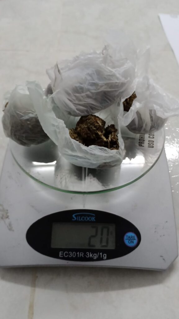 Tras el procedimiento de rutina, se secuestraron seis envoltorios de nylon transparentes, con una sustancia vegetal color verde amarronada, que arrojó un peso total de 20 gramos, y que, ante el test orientativo de campo, su resultado fue positivo para Cannabis Sativa.