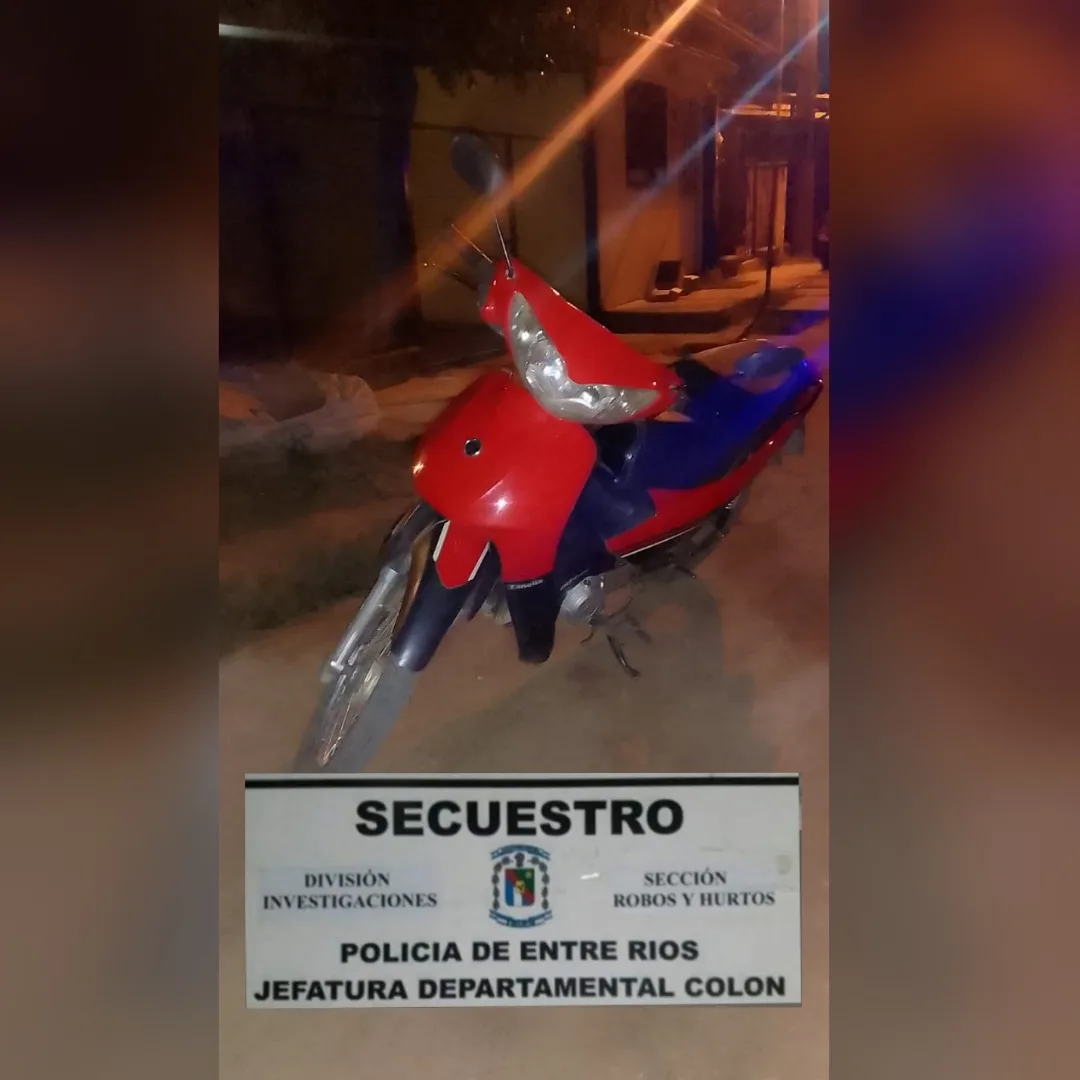 Alrededor de las 02 de la madrugada, personal policial de Colón, procedió a identificar a una pareja de jóvenes (ambos de 20 años de edad)que se conducían en una motocicleta marca Zanella modelo Zb 110cc, en calle Primera Junta al Norte donde al consultar por la documentación y titularidad del rodado ambos manifestaron claras contradicciones, lo que motivo el chequeo de numeración de cuadro y posterior a esto contando con datos de su real titularidad se pudo establecer que la motocicleta había sido robada de calle General Paz al 200. Se dio conocimiento a la Fiscalía en Turno la que dispuso que tanto su conductor y su acompañante queden detenido y alojado en dependencia policial imputado del delito de Robo de un Ciclomotor en la Vía Pública, en relación al rodado fue secuestrado y posteriormente será restituido a su propietario.