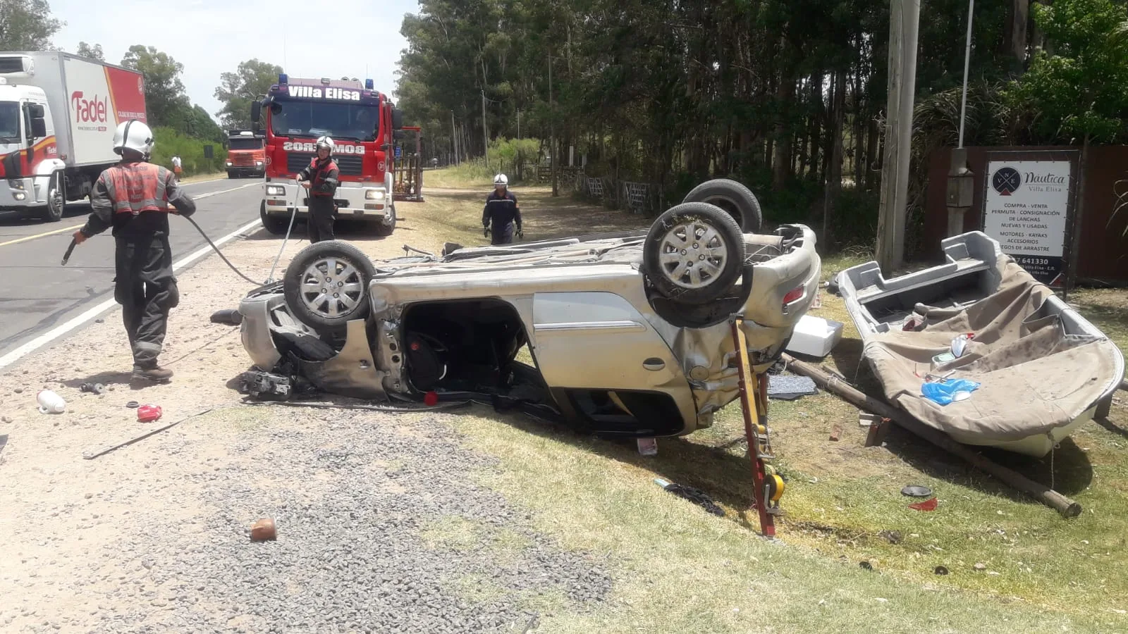 Sucedió en horas del mediodía, personal de Comisaría Villa Elisa, debió intervenir en un accidente de tránsito, ocurrido en el km 6.3 de la Ruta Nacional 130, lugar donde se produce un despiste y vuelco de un automóvil marca Peugeot, modelo 207, conducido por una ciudadana de 51 años de edad, quien iba acompañada por un masculino de 54 años de edad, oriundos de Paraná, quedando dicho rodado sobre la banquina Norte, como consecuencia resultaron ambos ocupantes con lesiones de carácter Leves.