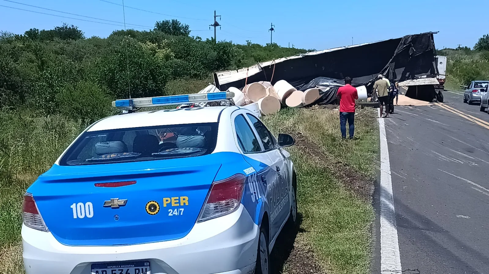 Según informaron fuentes policiales, el transportista —un joven de 26 años— viajaba desde Misiones con destino a San Luis cuando, por motivos que aún se investigan, “mordió la banquina derecha” y perdió el control del vehículo. El camión se desplazó hacia la izquierda y terminó volcado, provocando la caída de las bobinas de papel que transportaba.